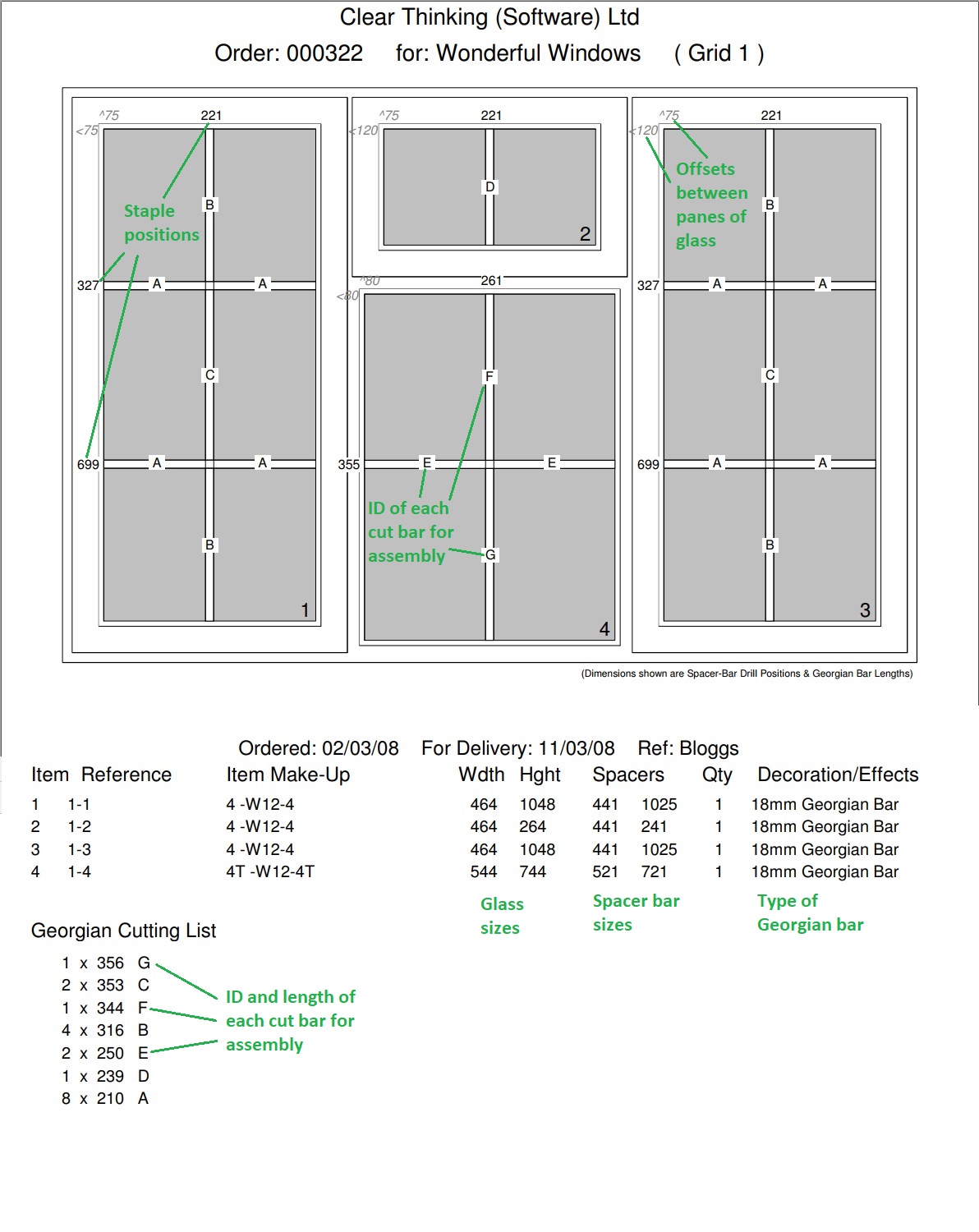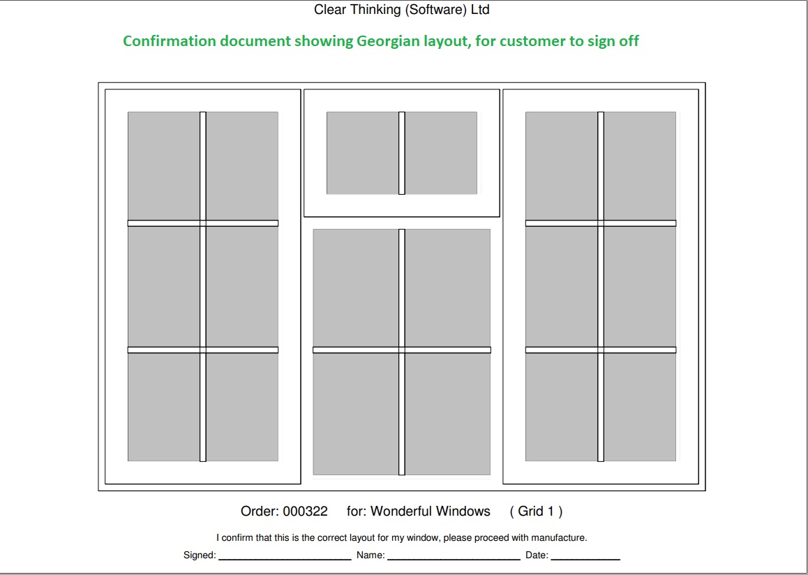 This includes facilities for arranging rectangular Georgian grids with print-outs tailored to the type of grid for fast and reproducible manufacture. Allows manual positioning of Georgian bars when mullions and transoms cannot be moved. Here’s sample printouts of the customer approval and factory assembly sheet
