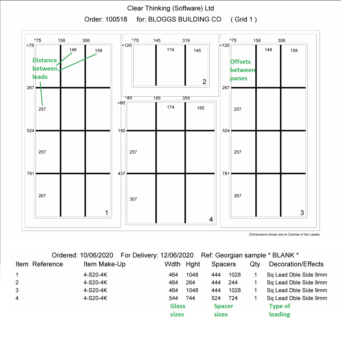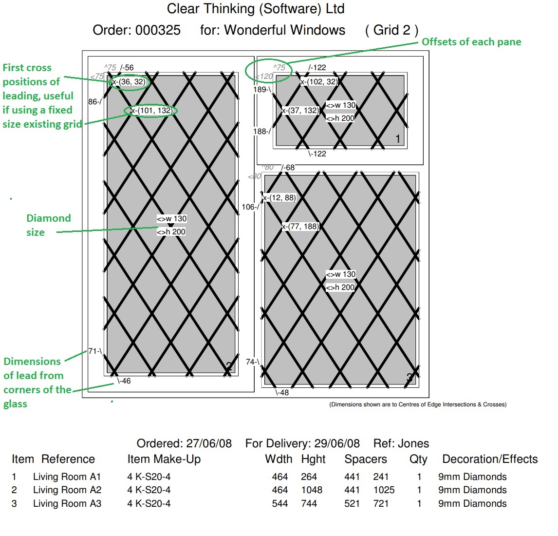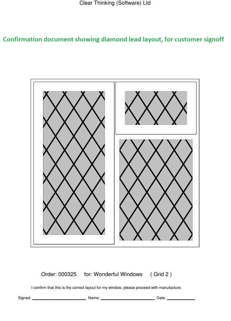 This includes facilities for arranging diamond grids with print-outs tailored for fast reproducible manufacture, with easy to read shop floor instructions, and choice of diamond being centred to the cross or centre of a diamond, across the whole window or an individual pane. The diamond layout can be printed on an A0 plotter for the shop floor to work from. Here’s sample printouts of the customer approval and factory assembly sheet