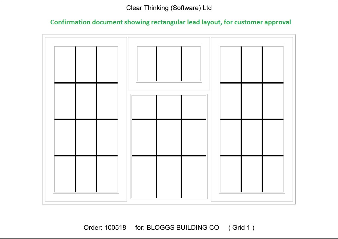 This includes facilities for arranging square or rectangular grids with print-outs tailored to the type of grid for fast and reproducible manufacture. Allows manual positioning of leaded grids when mullions and transoms cannot be moved. The grid can be printed on an A0 plotter for the shop floor to work from. Here’s sample printouts of the customer approval and factory assembly sheet